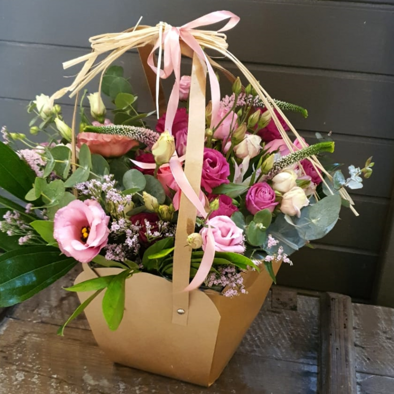 זר ורוד ומקסים בתיק נייר מורכב מליזיאנטוסים ורודים, ורדים ורודים ולימוניום ורוד מקושט בסרטים.